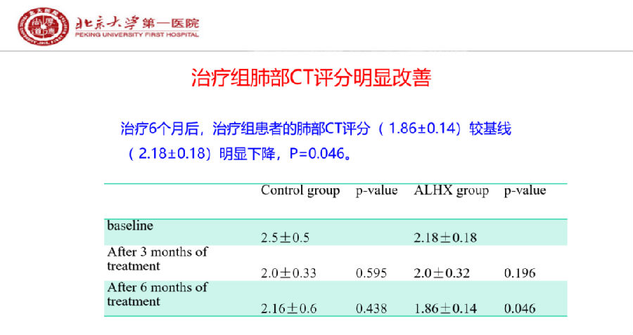 基于安络化纤抗肝纤维化的突出疗效,国家中医药管理局启动了安络化纤治疗新冠肺炎康复期患者的安全性、有效性分析,采用前瞻性、多中心、开放、随机、对照研究,以北京大学医院为核心,联合武汉肺科医院、鄂州中心医院、蚌埠医学院第一附属医院、阜阳市第二人民医院、广州市第八医院等临床单位。研究结果显示,治疗6个月后,治疗组患者的肺部CT评分(1.86±0.14)较基线(2.18±0.18)明显下降(P=0.046);在治疗6个月的患者(19例)中,安络化纤组6分钟步行试验完成率明显提高(P=0.002);对照组中则无明显差异。